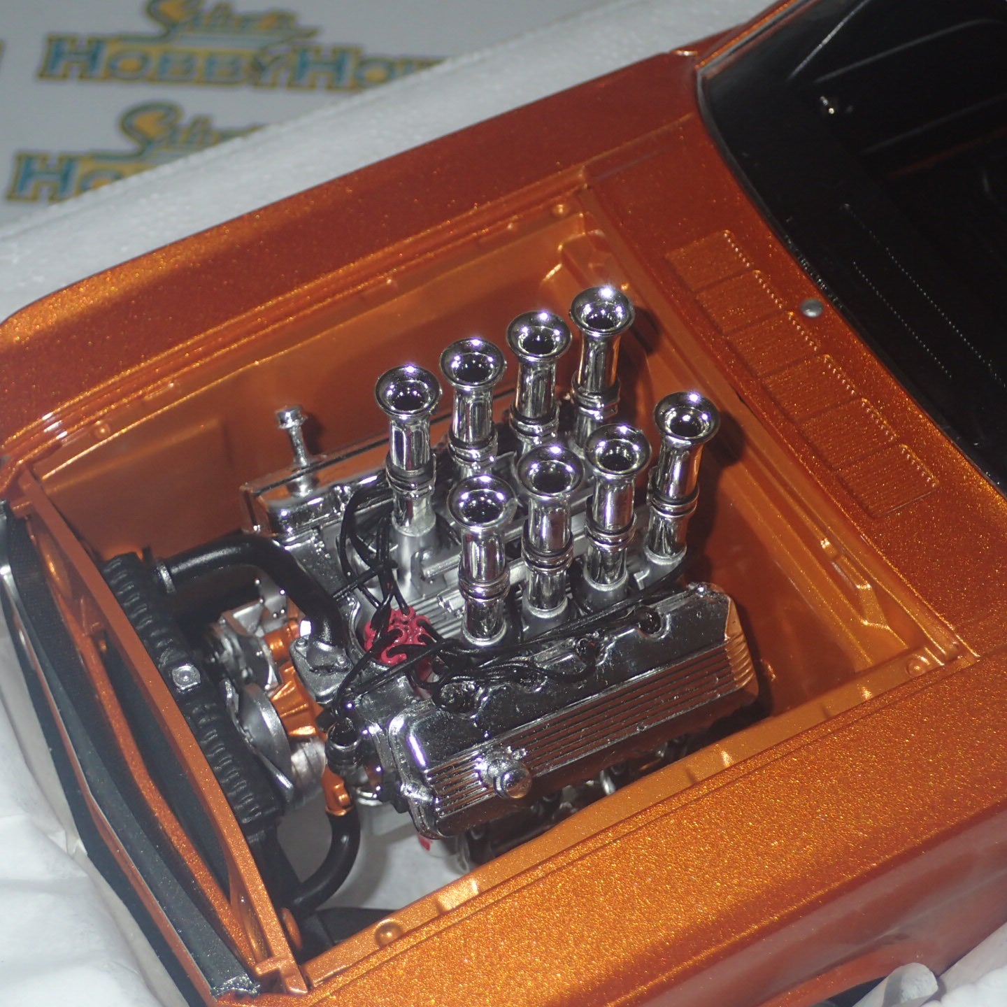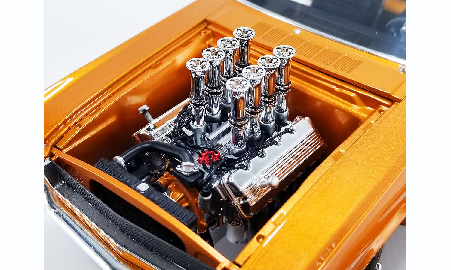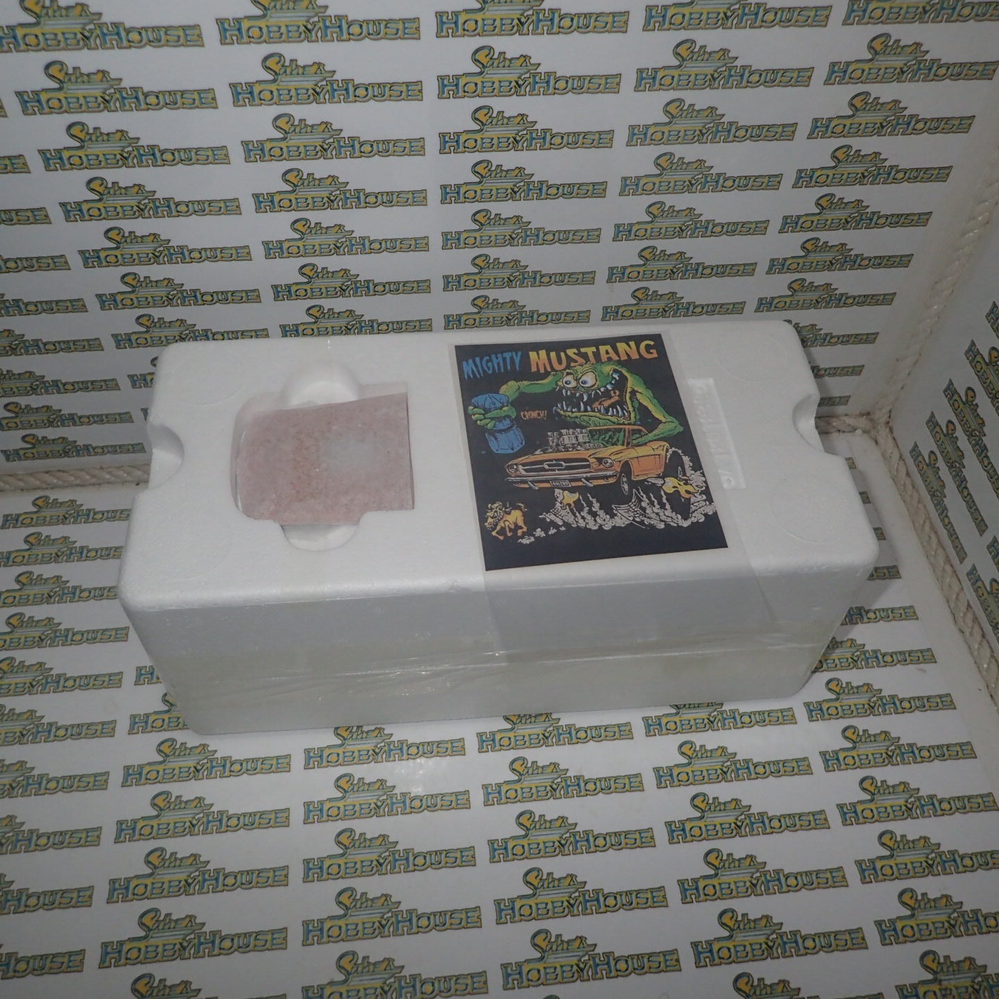 ACME has combined the 1965 Ford Mustang A/FX with the iconic artwork of Ed Roth's Rat Fink Mighty Mustang to bring you this next release in our Rat Fink lineup! This wicked Mustang A/FX is powered by a injected 427 cammer engine sporting velocity stacks. Along with the creature on the back quarter panels and Might Mustang down the sides, you'll note the "flying eye' on the trunk lid! The model also features a removeable roof, parachute pack, and Ed Roth Studio decal on the rear.