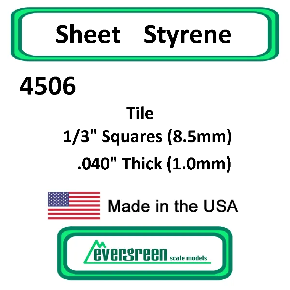 Includes 1 sheet of white styrene Tile 1/3" Squares (8.5mm) .040" Thick (1.0mm)