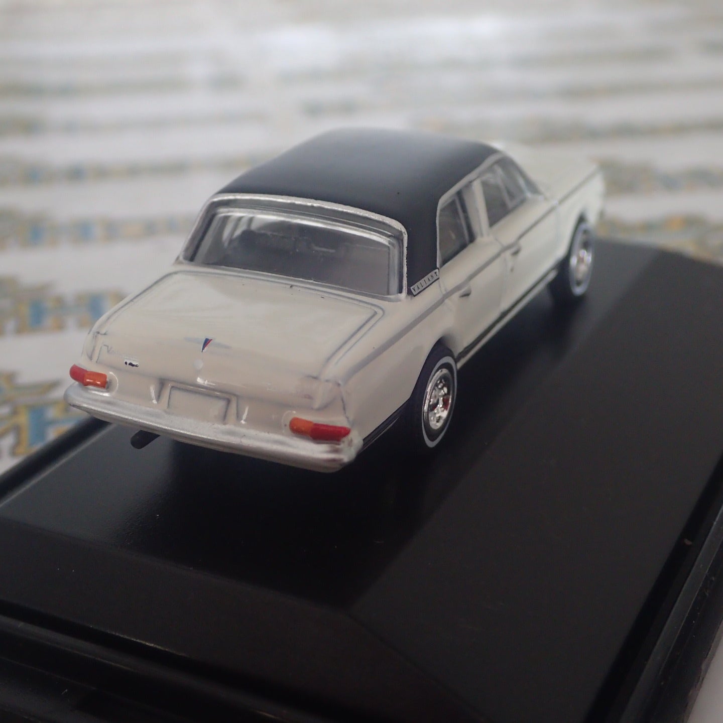 Beautifully detailed all metal (even the baseplate) 1:87 scale 1963 Valiant AP5 in Alpine White with Black Vinyl Roof. Limited run of just 2,000 pieces worldwide. Complete with acrylic display case.