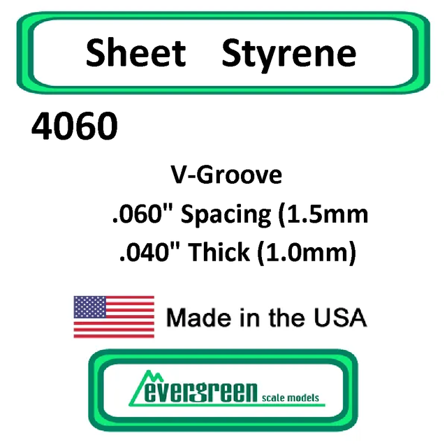 Includes 1 sheet of white styrene V-Groove .060" Spacing (1.5mm) .040" Thick (1.0mm)