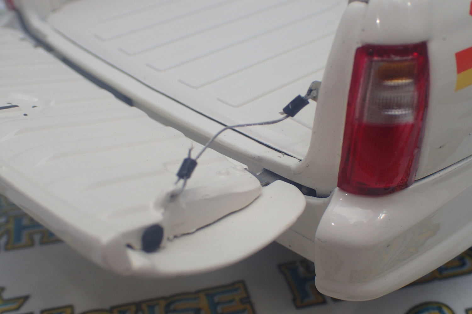 Remove the Hard Tonneau Cover and carefully lower the Tail Gate to see retaining cables and etch-metal hinges. The Soft Vinyl Tray Floor Mat is also removable.