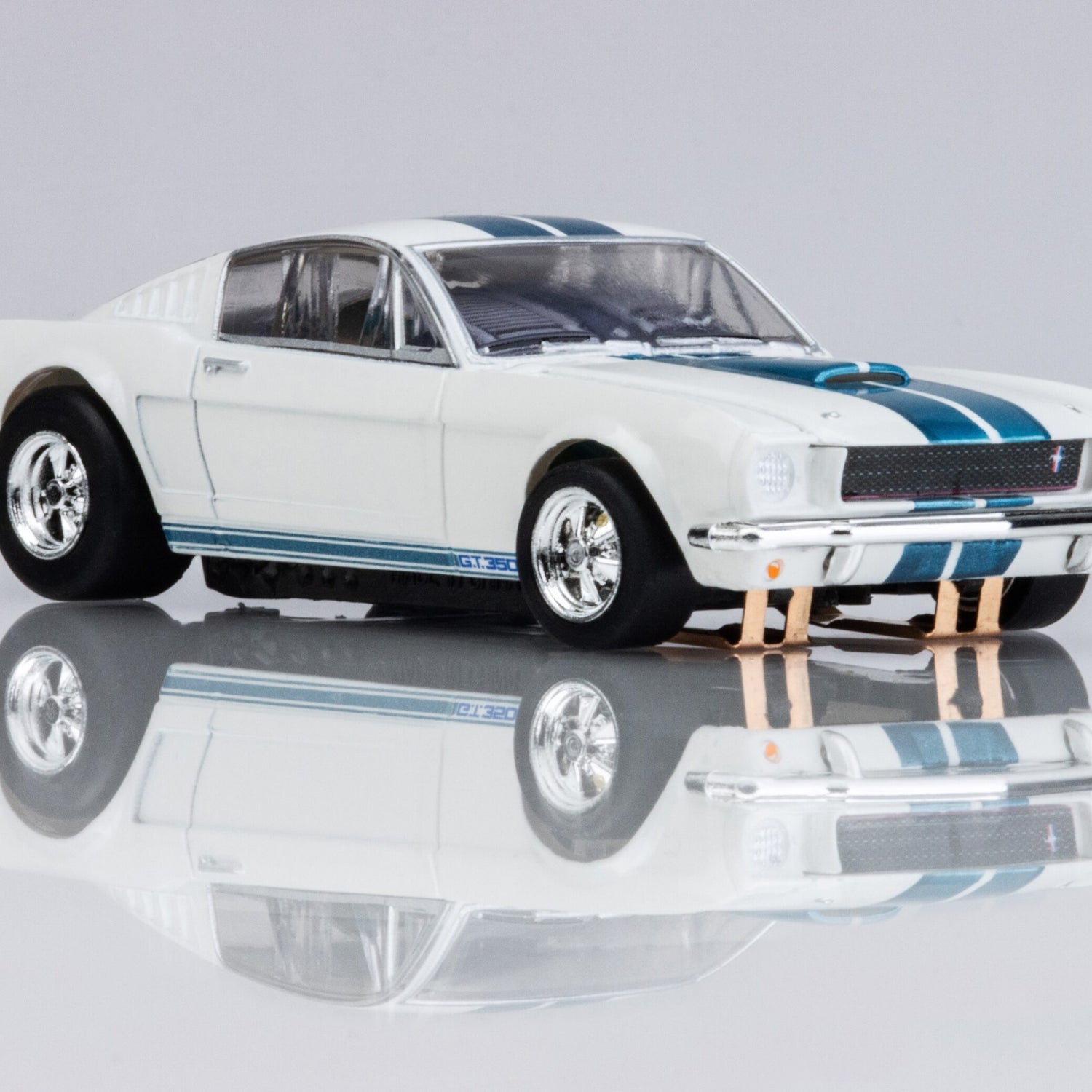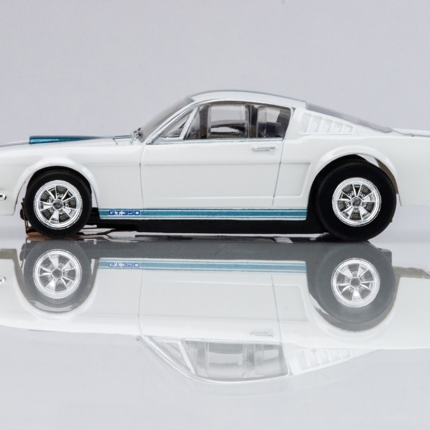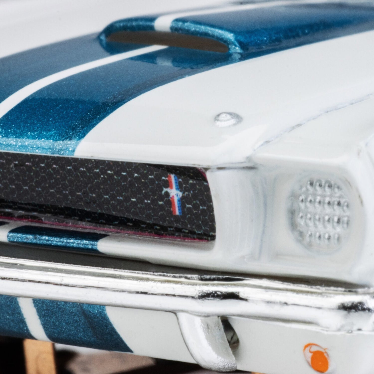 Launched in 1964, the Ford Mustang was a trend setter. Relatively compact, the car was aimed at young people for its affordability and sporty nature. The product was so successful it was the most successful vehicle launch since the 1927 Model A and sold a million cars in less than two years. It even created a class all its own, called the “pony” car. Of course, more is always better and by mid-1964 Lee Iaccoca sought out Carroll Shelby to create a racing version of the Mustang. Shelby had only months to build a better handling, harder-hitting powerhouse if it was to compete as a B Production SCCA race car. For extra drama, qualifying for the SCCA class required production of no less than 100 street-legal examples. Engineered by Chuck Cantwell, Ken Miles helmed the mechanical development with designer Peter Brock on the graphics. They were completed just in time for the 1965 season. With a 289 cubic inch V8 engine delivering 306 horsepower, the race car performed like a champ and won the B Production National Championships in 1965 and 1966. In fact, they beat Shelby’s own Cobras! And the streetcar? They made over 2,300 in those two years. Now AFX brings the Shelby Mustang to life with its white body donning original Guardsman Blue metallic race stripes and chrome wheels. CHASSIS TYPE: Long (1.7”) Wheelbase Chassis