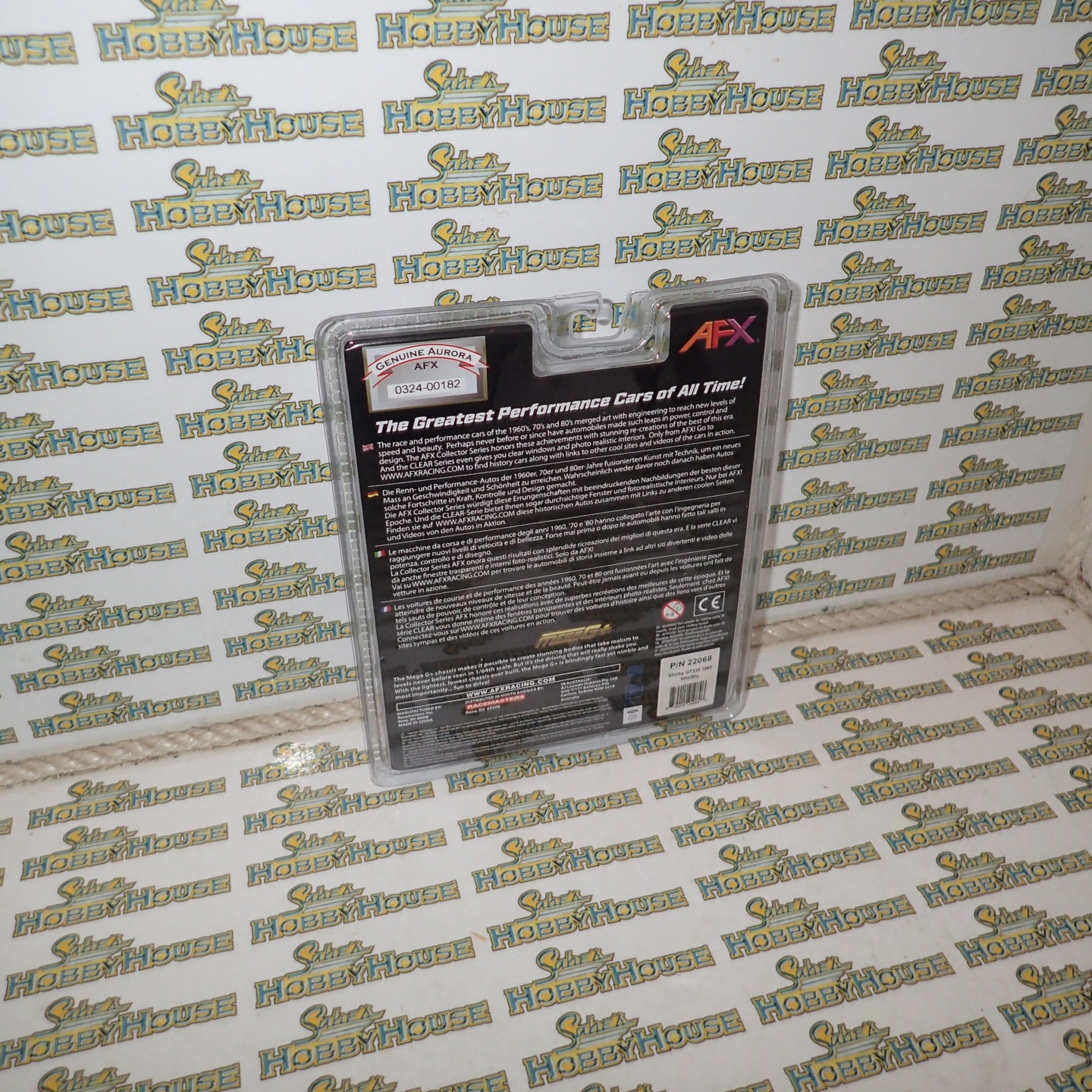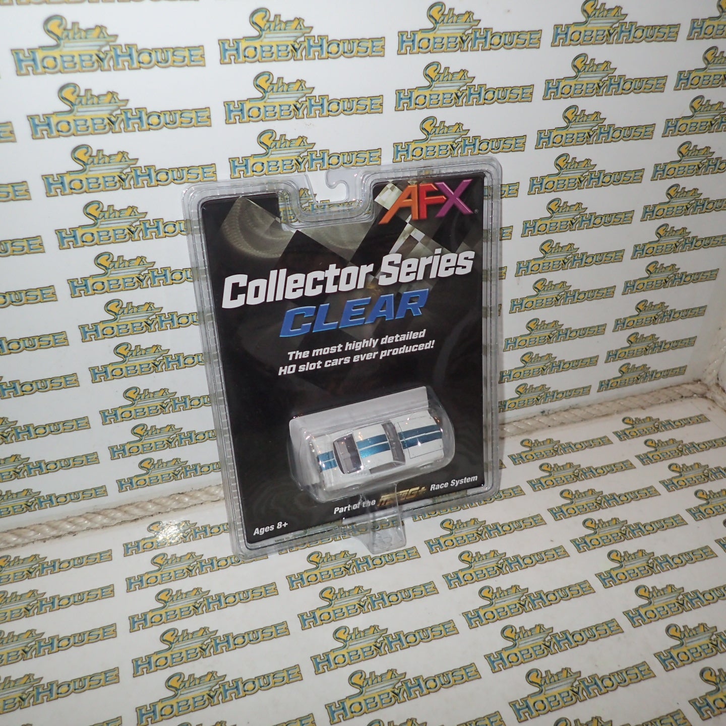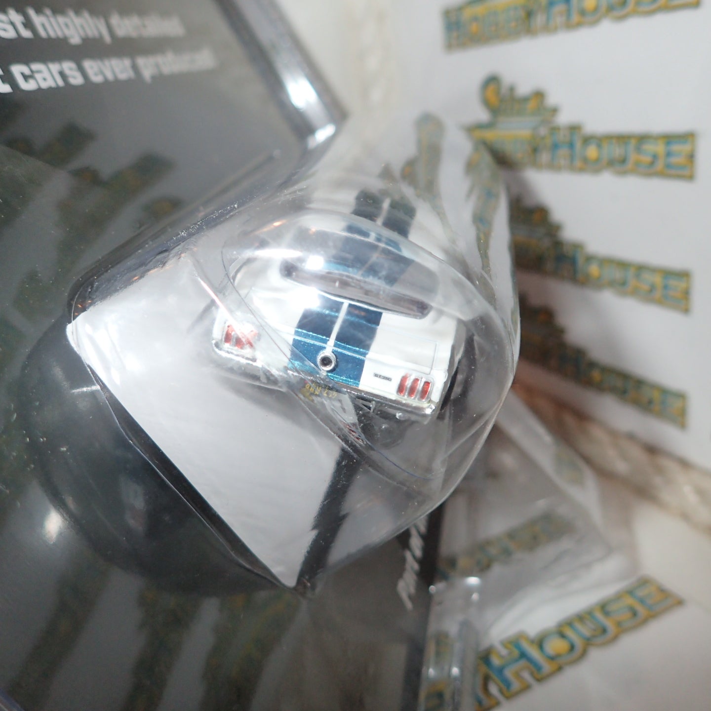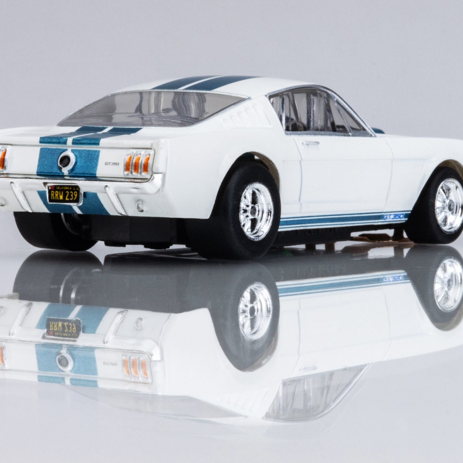 Launched in 1964, the Ford Mustang was a trend setter. Relatively compact, the car was aimed at young people for its affordability and sporty nature. The product was so successful it was the most successful vehicle launch since the 1927 Model A and sold a million cars in less than two years. It even created a class all its own, called the “pony” car. Of course, more is always better and by mid-1964 Lee Iaccoca sought out Carroll Shelby to create a racing version of the Mustang. Shelby had only months to build a better handling, harder-hitting powerhouse if it was to compete as a B Production SCCA race car. For extra drama, qualifying for the SCCA class required production of no less than 100 street-legal examples. Engineered by Chuck Cantwell, Ken Miles helmed the mechanical development with designer Peter Brock on the graphics. They were completed just in time for the 1965 season. With a 289 cubic inch V8 engine delivering 306 horsepower, the race car performed like a champ and won the B Production National Championships in 1965 and 1966. In fact, they beat Shelby’s own Cobras! And the streetcar? They made over 2,300 in those two years. Now AFX brings the Shelby Mustang to life with its white body donning original Guardsman Blue metallic race stripes and chrome wheels. CHASSIS TYPE: Long (1.7”) Wheelbase Chassis